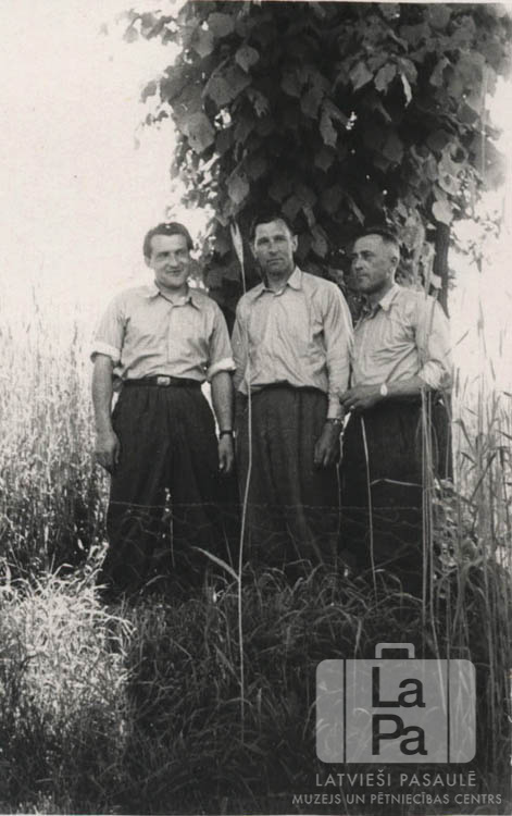 Trīs vīrieši stāv pie koka Vartas nometnē Lēzē (angļu zonā). Visiem vīriešiem gaiši krekli, ar uzrotītām piedurknēm. No kreisās: Roberts Stučka, Ādolfs Kechris, ? Linde.