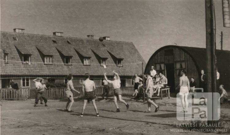 Vīrieši spēlē volejbolu māju pagalmā Vartas nometnē Lēzē (angļu zonā). Fonā ir divstāvu ēka, labajā pusē – angārs.