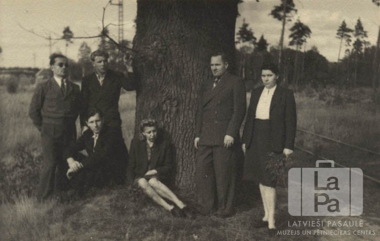 Seši cilvēki pie liela koka