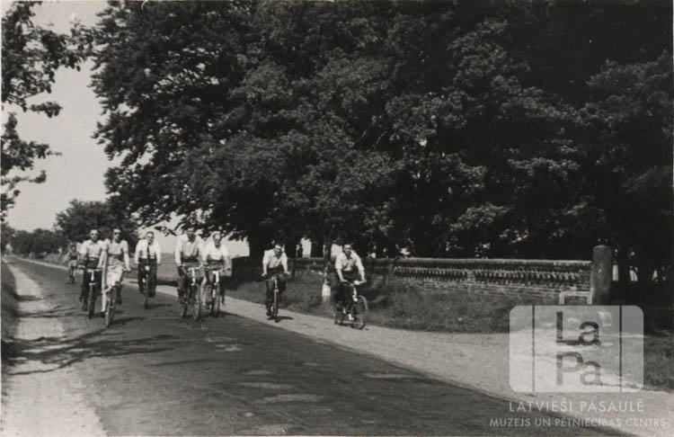 Cilvēku grupa no Vartas nometnes Lēzē (angļu zonā) izbraukumā ar divriteņiem. Riteņbraucēji brauc pa ceļu, ģērbušies gaišās drēbēs. Ceļam labajā pusē ir mežs, norobežots no ceļa ar zemu mūri.