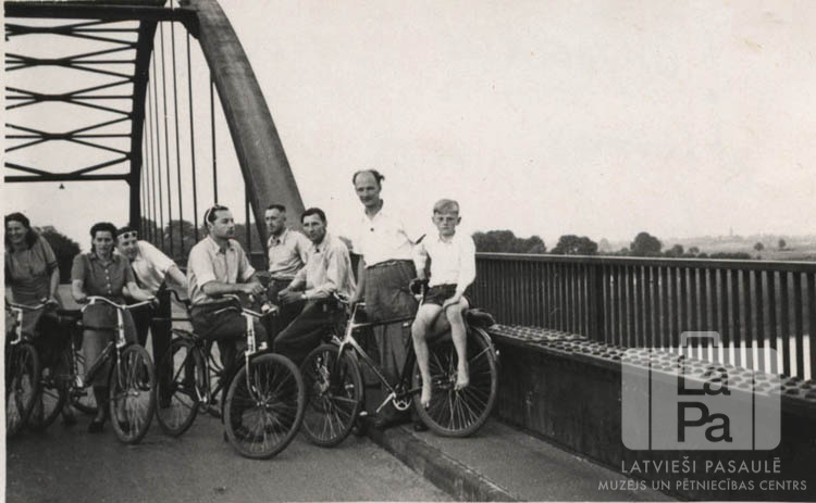 Cilvēku grupa no Vartas nometnes Lēzē (angļu zonā) ar divriteņiem uz Vēzeres tilta, atpakaļceļā no izbrauciena. Redzami astoņi cilvēki uz metāla tilta. Fonā labajā pusē ir redzami lauki un meži.