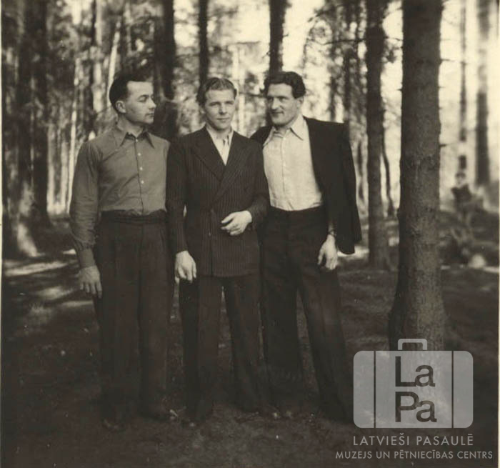Trīs vīri – darbabiedri – mežā pie Vartas nometnes Lēzē (angļu zonā). No kreisās: Francis Spalvis, Nikolajs Upans, Roberts Stučka. Divi vīri ir ģērbušies uzvalkos, trešais ir bez žaketes.