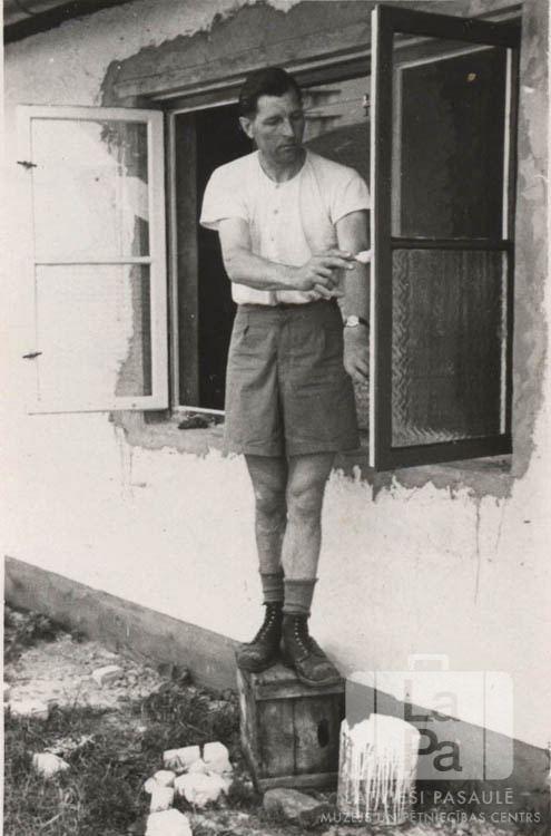 Ādolfs Kechris krāso logu rāmjus Vartas nometnē Lēzē (angļu zonā). Vīrietis ir pakāpies uz mazas kastes, kurai blakus ir gaišas krāsas spainis; ēkas logi ir atvērti. Ēkas ārsiena ir gaiša, logi – tumši.