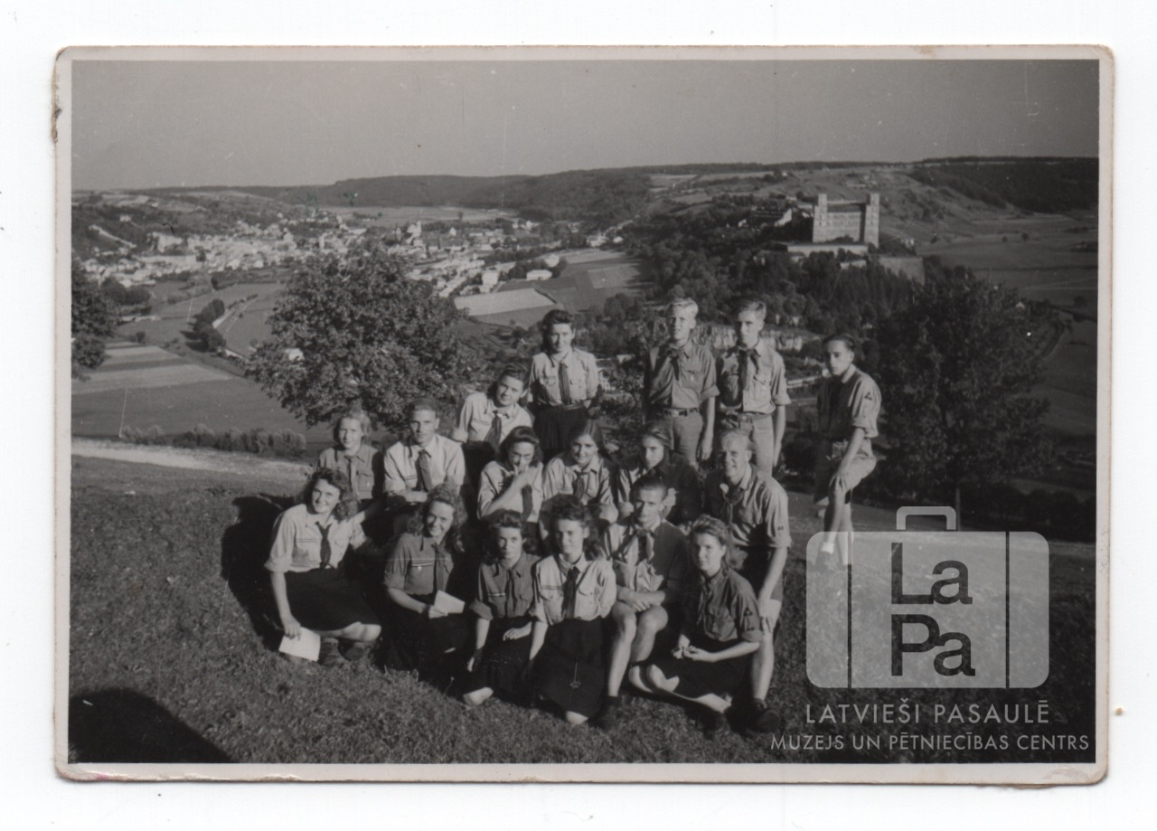 Rebdorfas skauti un gaidas uz kalna pie Eihštetes (amerikāņu zonā) laikā, kad Eihštetē notika latviešu dziesmu svētki. Jaunieši ir ģērbušies formastērpos. Fonā ir pauguriem ieskauta ieleja ar laukiem, mežiem un ciematu kreisajā pusē. Fonā labajā pusē ir pils kalna galā.