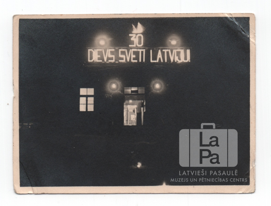 Tumsā izgaismota pārvaldes ēka Fihtenbīles nometnē Veidenē (amerikāņu zonā) Latvijas Republikas proklamēšanas 30. gadadienā. Uz ēkas sienas ir spilgts, izgaismots uzraksts: "30 / DIEVS SVĒTĪ LATVIJU!". Zemāk, zem uzraksta, spīd ēkas logi, redzamas atvērtas ieejas durvis. Priekšplānā uz zemes tumsā spīd aizdegtas tējas sveces.