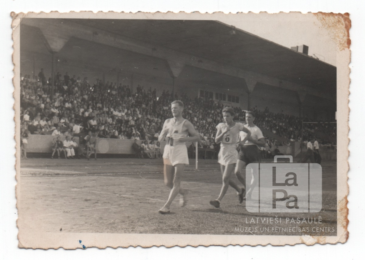 Trīs soļotāji meistarsacīkstes vieglatlētikā Nirnbergā (amerikāņu zonā). Fonā ir ar jumtu klātas stadiona tribīnes, pilnas ar skatītājiem. Priekšā, pirmais no kreisās: Jānis Daliņš.