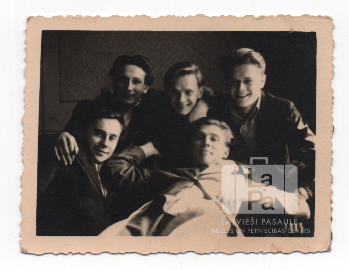 Pieci vidusskolnieki iekštelpās Fuldas nometnē (amerikāņu zonā). Priekšā viens puisis ir izstiepies gareniski, iespējams, uz galda. Pārējie puiši sēž aizmugurē, rokas uzlikuši viens otram uz pleciem. Grupā ir redzami: Laimdots Grendze, Gunārs Znotiņš, Vitauts Grīnvalds, O. Šubiņš, Alfreds Juzeps.