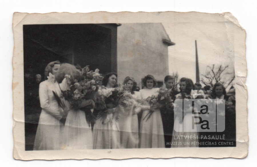 Jaunieši iesvētībās Fuldā (amerikāņu zonā). Jaunieši stāv rindā, ar ziediem rokās. Jaunietes ir ģērbušās gaišās kleitās; puisis ir ģērbies uzvalkā. Fonā ir citi cilvēki un mūra ēka.