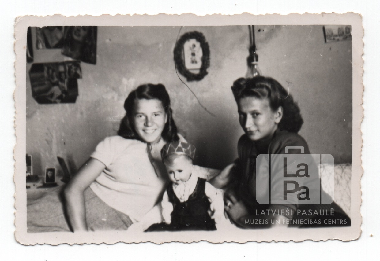 Māsas Ozoliņas ar lelli Fuldas nometnē (amerikāņu zonā). Jaunietes guļ istabā uz gultas, lelle tautastērpā ir viņām pa vidu. Fonā kreisajā pusē uz maza galda ir vairākas fotogrāfijas. Pie sienas ir attēli/ plakāti. No kreisās: Daila Ozoliņa un Nora Ozoliņa (pr. Plostniece).