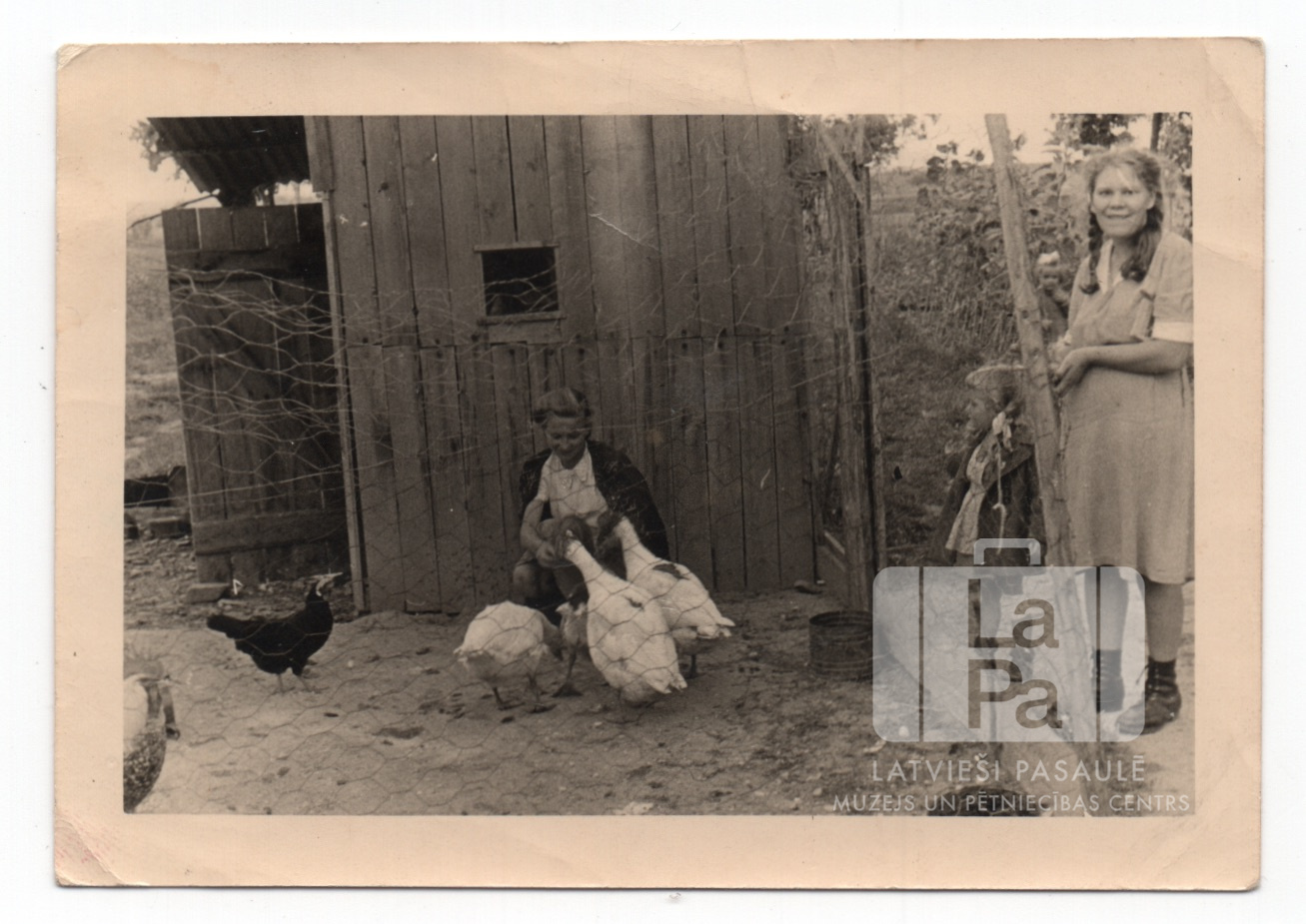 Gunta Ozoliņa baro savu zosu saimi Memmingenē (amerikāņu zonā). Jauniete atrodas zosu mājputnu aplokā, pie koka dēļu būdas ar atvērtām durvīm. Redzamas zosis, vista un gailis. Labajā pusē, ārpus iežogojuma, stāv jauniete ar mazu meiteni.