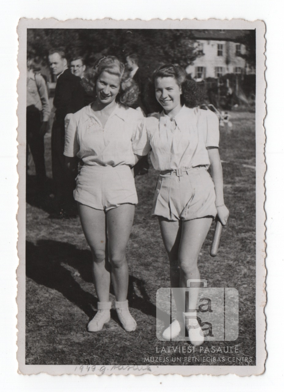 Māsas Ozoliņas gaišos sporta tērpos Memmingenē (amerikāņu zonā). Vienai māsai rokās ir stafetes nūja. Aizmugurē stāv jaunekļi. Fonā ir koki un aiz žoga – gaiša divstāvu mūra ēka. No kreisās: Nora Ozoliņa (pr. Plostniece) un Daila Ozoliņa.
