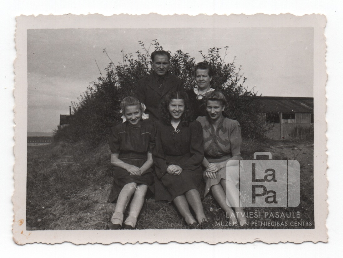 Ozoliņu ģimene Memmingenē (amerikāņu zonā) īsi pirms izceļošanas uz ASV. Priekšā trīs jaunietes sēž zālē, aizmugurē vecāki stāv kājās. Fonā ir neliels uzkalns, aiz tā ir vienstāvu koka baraka. Foto autors: A. Dundurs.