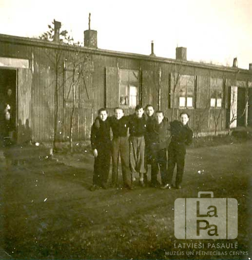 Seši jauni puiši pie savas vienstāvu koka barakas Zēdorfas nometnē (angļu zonā) 1947. gada ziemā. Divas barakas durvis ir atvērtas; kreisajā pusē iekšā ir redzama sieviete. Zēni priekšā, no kreisās: ? Barovskis, ? Apsītis, ? Vogts, ? Lipiņš, ? Lemkins un Ojārs Āboliņš.