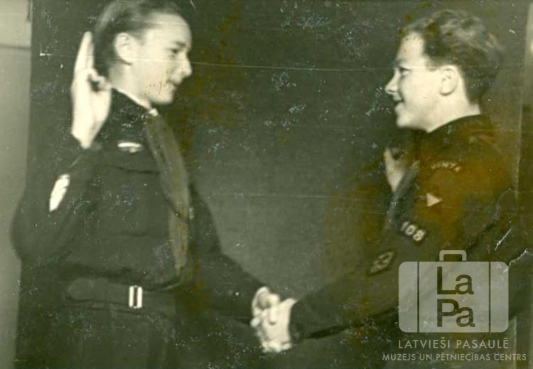Divi Ventas 108. skautu vienības skauti sasveicinās nodarbībās iekštelpā Rotenburgas nometnē (Vimmē, angļu zonā). No kreisās: ? Lemkins un Ojārs Āboliņš.