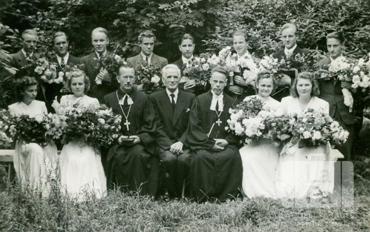 Iesvētāmie ar mācītājiem un draudzes priekšnieku Emdenes nometnē (angļu zonā). Jauniešiem rokās ir puķes, pirmajā rindā, vidū, sēž trīs mācītāji amata tērpos. Pirmajā rindā, no kreisās: trešais Alberts Birnbaums (mācītājs), ceturtais ? Kinstlers (draudzes priekšnieks) un piektais Pēteris Nesaule (mācītājs), sestā Ingrīda Kārkliņa. Otrajā rindā, sestais no kreisās: Ojārs Āboliņš.
