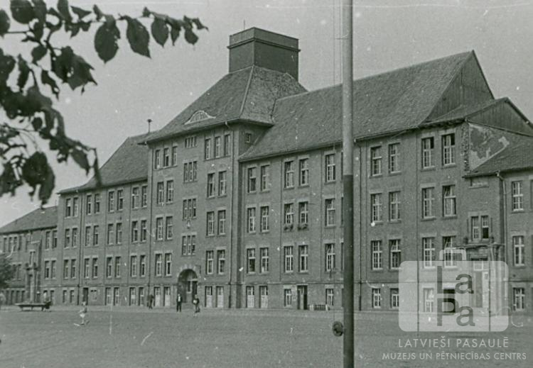 Galvenā ēka Emdenes nometnē (angļu zonā) – bloka māja Nr. 4, kurā bija nometnes administrācija un latviešu skola. Trīsstāvu mūra ēka, kuras priekšā ir liels, plašs laukums. Pāri laukumam pastaigājas daži cilvēki. Priekšplānā ir karoga masts.