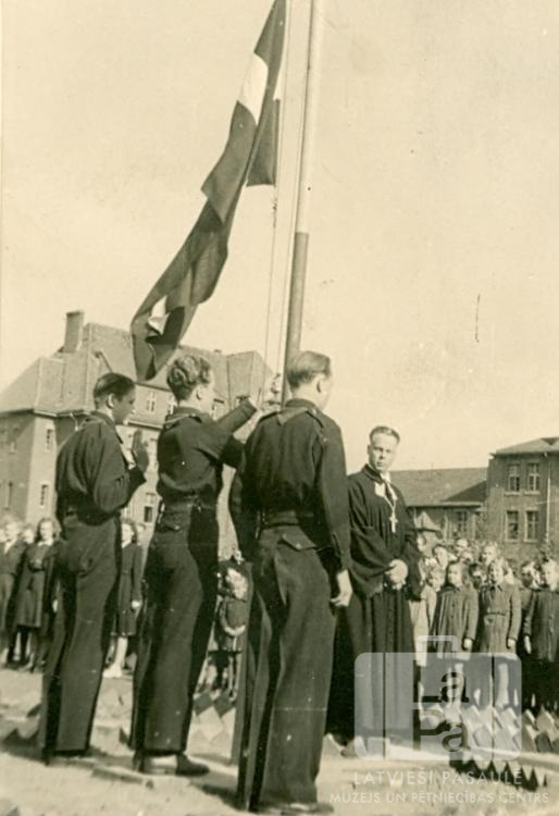 Skauti un mācītājs valsts svētku rītā ar Latvijas karoga uzvilkšanu un svētbrīdi Emdenes nometnē (angļu zonā). Trīs skauti stāv priekšā pie karoga masta, aiz kura stāv mācītājs amata tērpā. Aizmugurē stāv skatītāji. Fonā ir divas vairākstāvu mūra ēkas. Priekšplānā, no kreisās: otrais Ojārs Āboliņš (uzvelk karogu), ceturtais Pēteris Nesaule (mācītājs). Foto autors: J. Siļķēns.