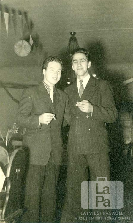 Divi jauni draugi svētku ballē Ventorfas nometnē (angļu zonā). Jaunieši ir ģērbušies uzvalkos, ar cigaretēm rokās. Apkārt ir koka krēsli, uz galda kreisajā pusē ir vāze ar ziediem; telpa ir dekorēta ar papīra rotājumu virteni. No kreisās: Ojārs Āboliņš un Harijs Zikmanis. Foto autors: ? Grāvītis. Par šo gadījumu Ojārs Āboliņš stāsta: "Mēs kādreiz bijām stalti, jauni ballītē gājēji."