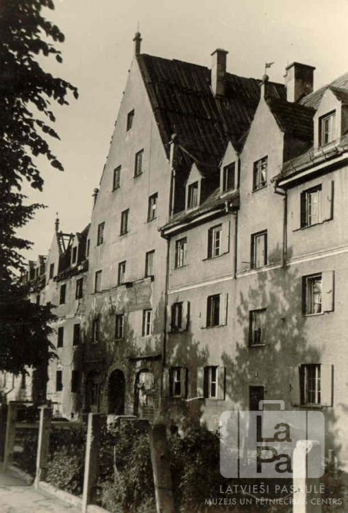 Trīsstāvu dzīvojamā ēka Hohfeldes nometnes Augsburgā (amerikāņu zonā). Ēkas priekšā ir ar betona stabiem norobežoti apstādījumi. Ēkas vidējai daļa ir slīps, stāvs jumts. Foto autors: ? Štāks.