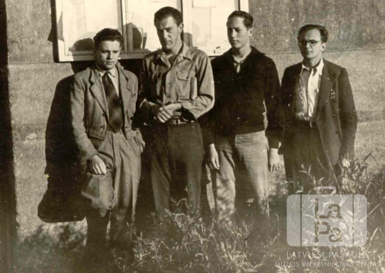 Četri vīrieši stāv pie ēkas loga Augsburgā (amerikāņu zonā). Priekšplānā neliels krūms. Pirmais no labās: Ojārs Štāks.