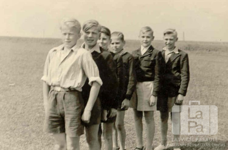 Seši zēni Hohfeldes nometnē Augsburgā (amerikāņu zonā). Iespējams, zēni bija vai nu skolēni, vai arī skauti. Fonā ir plašs lauks.