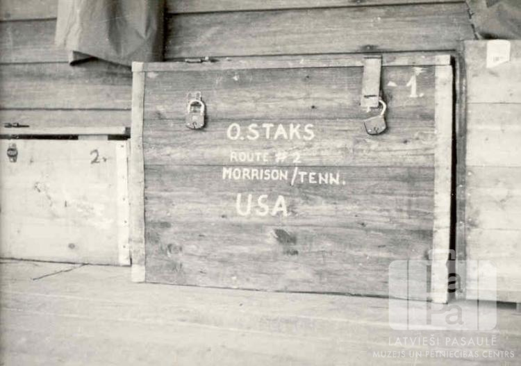 Ojāra Štāka izceļošanas kastes Augsburgā (amerikāņu zonā). Kastes stāv pie koka dēļu ārsienas. Lielākajai kastei priekšā ir divas slēdzenes un uzraksts: "O. Staks / ROUTE #2 / MORRISON/TENN. / USA". Foto autors: ? Štāks.