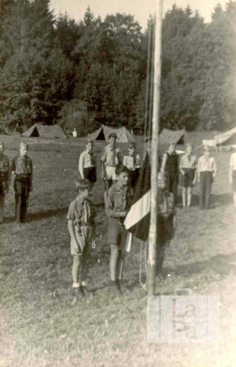 Raunas 81. skautu vienības skauti no Hohfeldes nometnes Augsburgā (amerikāņu zonā) 1946. gada vasarā savā skautu nometnē uzvelk Latvijas karogu. Trīs zēni stāv pie karoga masta, fonā stāv vairākas zēnu ierindas. Visi ir ģērbušies skautu formastērpos. Fonā meža malā ir uzslietas teltis.