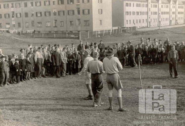 Pirmās pārvietoto personu skautu padomes pārstāvji piedalās ugunskura sarīkojumā Hohfeldes nometnē Augsburgā (amerikāņu zonā). Priekšā, vidū, stāv trīs vīrieši skautu formastērpos. Apkārt ir jauniešu grupa. Visi stāv klajā vietā uzkalnā; fonā, zemāk, ir vairākas nometnes trīsstāvu dzīvojamās ēkas.