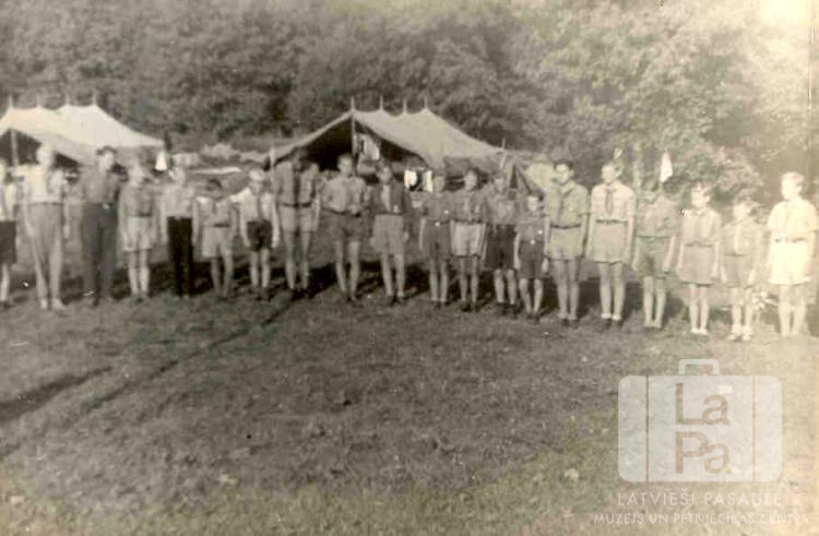 Raunas 81. skautu vienības skauti no Hohfeldes nometnes Augsburgā (amerikāņu zonā) stāv ierindā savas skautu nometnes vakara jundā 1946. gada vasarā. Visi ir ģērbušies formastērpos. Fonā, meža malā, ir uzceltas teltis.