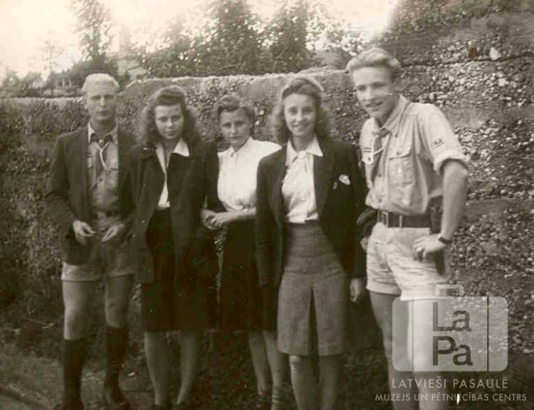 Raunas 81. skautu un Raunas 78. gaidu vienību roveri un lielgaidas Hohfeldes nometnē Augsburgā (amerikāņu zonā) 1947. gada vasarā. Piecu jauniešu grupa pie mūra – divi puiši formastērpos un trīs jaunietes. Aiz mūra ir ir koku galotnes un kreisajā pusē, tālumā, arī ēku jumti.