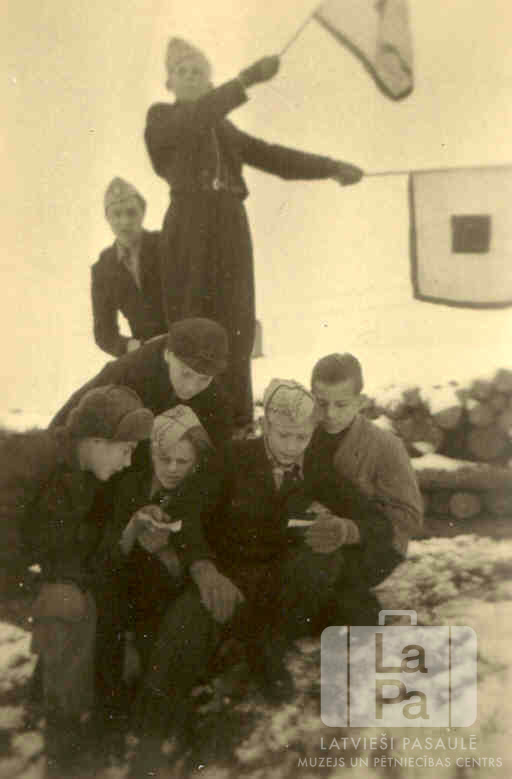 Raunas 81. skautu vienības Lūšu kops mācās semaforu signalizēšanu skautu nodarbībās Hohfeldes nometnē Augsburgā (amerikāņu zonā). Priekšā zēni sēž uz apsnigušas zemes un pēta papīra lapas; aizmugurē stāv divi jaunieši, viens signalizē ar gaišiem karogiem rokās. Uz viena karoga ir tumšs kvadrāts. Fonā, labajā pusē, ir sakrauta, apsnikusi, zema malkas rinda.