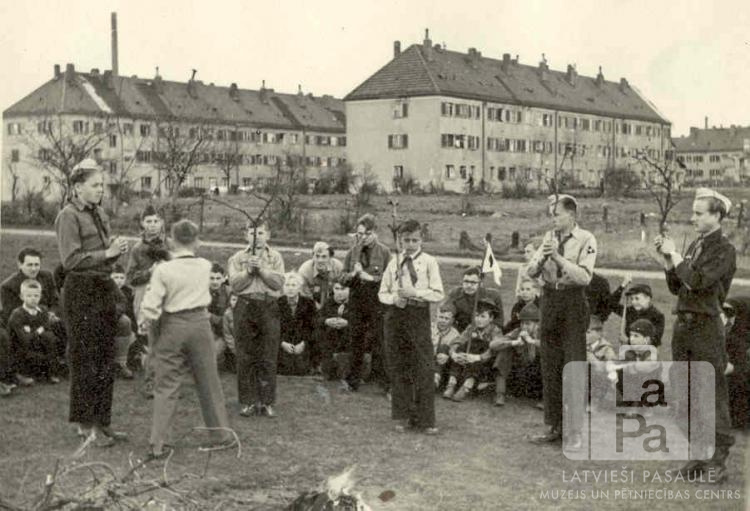 Pirmās pārvietoto personu skautu padomes pārstāvji piedalās ugunskura sarīkojumā Hohfeldes nometnē Augsburgā (amerikāņu zonā) un noskatās Raunas 81. skautu vienības skautu grupas priekšnesumu. Priekšplānā skauti formastērpos stāv rindā ugunskura priekšā, aiz viņiem uz zemes sēž rinda ar skatītājiem. Fonā ir dārzs ar kokiem bez lapām, aiz tā ir vairākas trīsstāvu dzīvojamās ēkas.