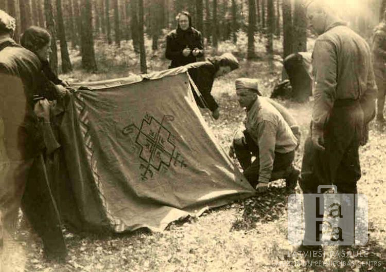 Vīrieši un sievietes formastērpos ceļ telti latviešu skautu un gaidu vadītāju sagatavošanas kursos netālu no Ambergas nometnes (amerikāņu zonā) no 1947. gada 27. jūnija līdz 3. jūlijam. Vairāki cilvēki ir ģērbušies formastērpos. Telts siena ir dekorēta ar latvisku rakstu. Fonā ir mežs.