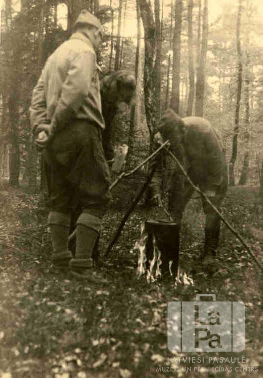Divi skauti un gaida stāv pie vārīšanas ugunskura latviešu skautu un gaidu vadītāju sagatavošanas kursos netālu no Ambergas nometnes (amerikāņu zonā) no 1947. gada 27. jūnija līdz 3. jūlijam. Vīrieši ir ģērbušies formastērpos. Virs ugunskura ir zaru trijkājis ar nostiprinātu katlu. Fonā ir mežs.