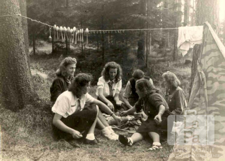 Sešas jaunietes formastērpos gatavo sviestmaizes latviešu skautu un gaidu vadītāju sagatavošanas kursos netālu no Ambergas nometnes (amerikāņu zonā) no 1947. gada 27. jūnija līdz 3. jūlijam. Jaunietes sēž uz zemes; virs viņām ir starp diviem kokiem novilkta aukla, uz kuras karājas karotes. Fonā mežs.