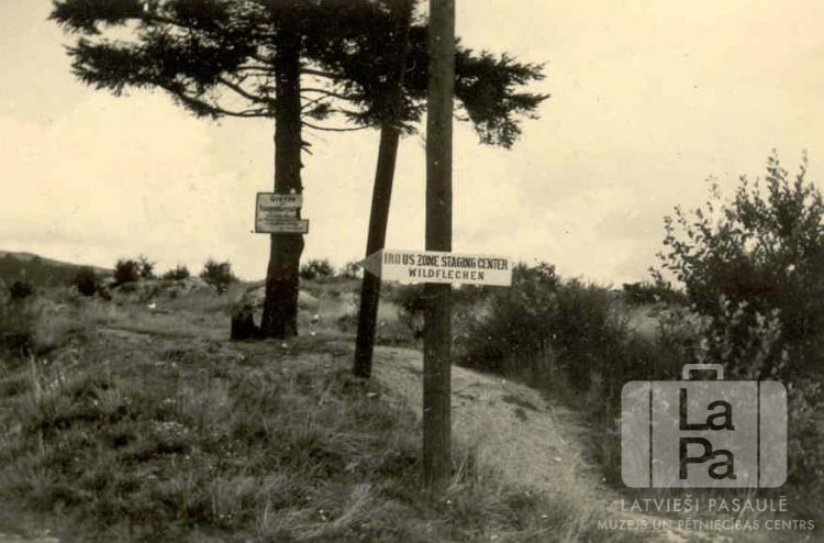 Zīme uz Vildflekenas nometni (amerikāņu zonā) – amerikāņu zonas emigrācijas pārbaužu nometne. Uz zīmes ir rakstīts: "IRO US ZONE STAGING CENTER / WILDFLECKEN." Stabs un skujkoks uz paugurainas, nelīdzenas zemes. Labajā pusē ir krūmi. Foto autors: ? Štāks.