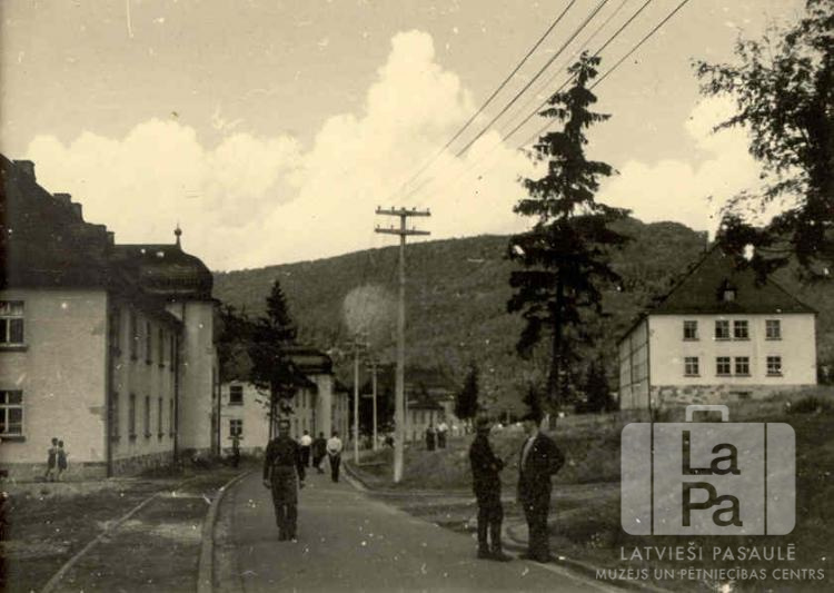 Iela ar ēkām Vildflekenas nometnē (amerikāņu zonā). Uz ielas pastaigājas cilvēki. Ielas labajā pusē ir telefona/ elektrības līnija. Fonā ir kalns.