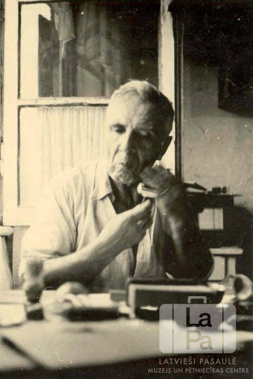 Arvīds Štāks skuj bārdu Vildflekenas nometnē (amerikāņu zonā). Vīrietis ar skuvekli sēž pie galda, uz kura ir dažādi priekšmeti un dokumenti. Fonā ir atvērts logs. Foto autors: ? Štāks.