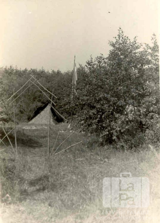 Paštaisīti skautu nometnes vārti, ko veidoja Liepājas 62. skautu vienība no Haunštetenes nometnes Augsburgā (amerikāņu zonā) 1948. gada vasarā. Aiz vārtiem ir teltis un masts ar karogu pļavā zema meža ielokā.