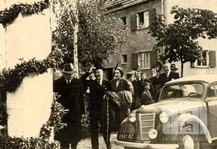 Vīrieši pie mašīnas Haunštetenes nometnē Augsburgā (amerikāņu zonā) Latvijas Republikas sūtņa Lielbritānijā Kārļa Zariņa vizītes laikā 1949. gada rudenī. Priekšā, kreisajā pusē, redzama ar zaru vainaga vītni apvīts vārta stabs. Priekšā, labajā pusē, stāv automašīna ar numura zīmi "8581 BZ". Fonā ir divstāvu mūra ēka, tās otrajā stāva logā ir redzams cilvēks.