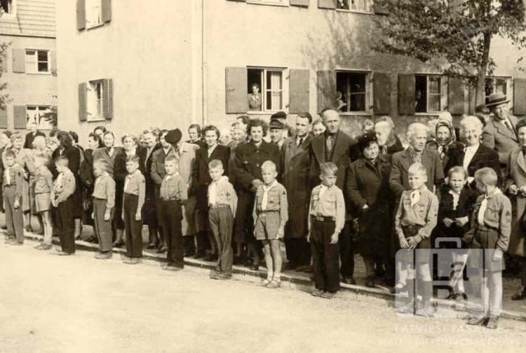 Liepājas 62. skautu vienības mazskauti formastērpos stāv godasardzē ielas malā Haunštetenes nometnē Augsburgā (amerikāņu zonā) Latvijas Republikas sūtņa Lielbritānijā Kārļa Zariņa vizītes laikā 1949. gada rudenī. Skauti stāv rindā viens otram blakus, aizmugurē stāv skatītāji. Fonā ir vairākas mūra ēkas; tuvākās ēkas logos redzami divi cilvēki.