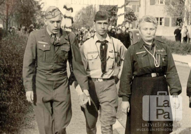 Skautu vadītāji formastērpos dodas pa ielu Haunštetenes nometnē Augsburgā (amerikāņu zonā) Latvijas Republikas sūtņa Lielbritānijā Kārļa Zariņa vizītes laikā 1949. gada rudenī. Divi vīrieši un viena sieviete. Fonā pie lieliem vārtiem uz ielas ir pulcējusies cilvēku grupa. Uz vārtiem, dekorētiem ar zaru vītnēm, ir burti "SVEICINĀTI". Ielas labajā pusē ir mūra ēkas. Trešā no kreisās: Zelma Lapsiņa (Rucavas 41. gaidu vienības vadītāja).