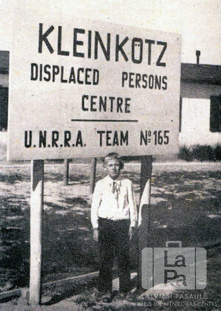 Zigurds Čaks bērnībā pie Ausmas nometnes Kleinkecā (amerikāņu zonā) oficiālās izkārtnes. Uz izkārtnes ir teksts: "KLEINKOTZ / DISPLACED PERSONS / CENTRE / U.N.R.R.A. TEAM No165". Fonā ir vienstāvu mūra ēka.