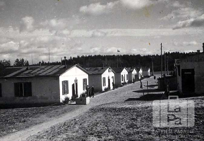 Iela un gaišas vienstāvu mūra ēkas Ausmas nometnē Kleinkecā (amerikāņu zonā). Uz ielas un pie ēkām ir redzami vairāki cilvēki. Aiz nometnes ēkām ir redzams Latvijas karogs augsta masta galā. Fonā, aiz nometnes, ir mežs.