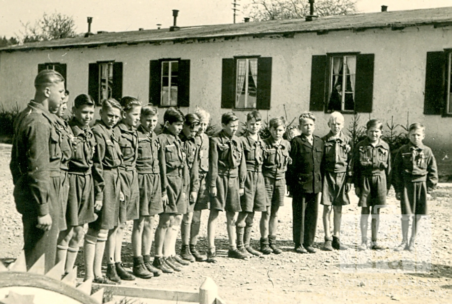 Tērvetes 52. skautu vienība ir pulcējusies Sv. Jura dienas karoga pacelšanas svinībām Ausmas nometnes centrā Kleinkecā (amerikāņu zonā), Latvijas karoga laukumā. Skauti formastērpos stāv ierindā. Fonā ir gaiša vienstāvu mūra ēka ar atvērtiem slēģiem; pa vienu logu skautus vēro sieviete. Skauti, no kreisās: Egons ?, Agris Šlesers (daļēji aizsegts), Oļģerts Gunārs Orleāns, Ivars Liepiņš, Dainis Vīgants, Aldonis Kalniņš, Roberts Bitenieks, Raimonds Cerbulis, Harijs Jancis, Andris Kadeģis, Uldis Bullītis, Jānis Štrauhmaniss, Zigurds Galviņš, Ārijs Liepiņš, Miervaldis Bitenieks, Indulis Plaudis.