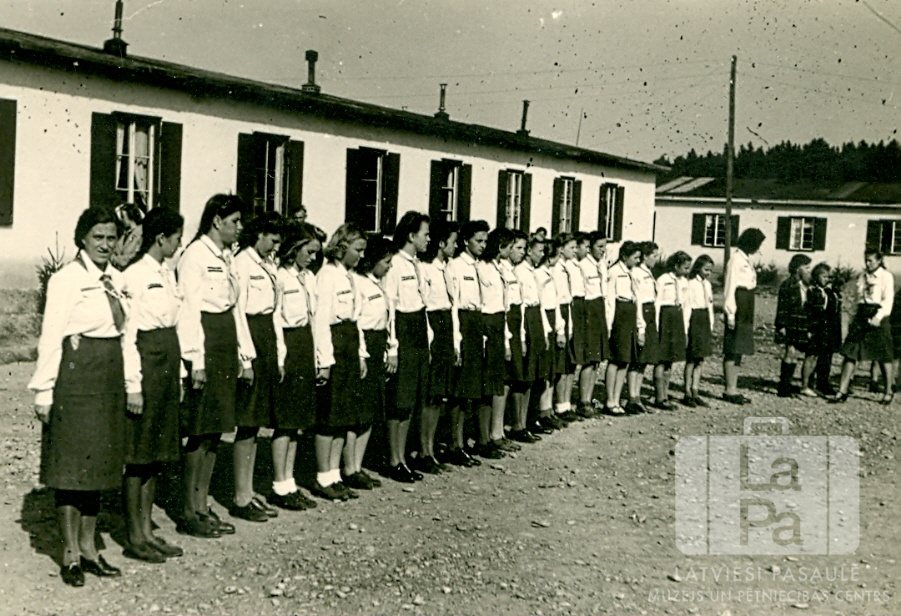 Tērvete 42. gaidu vienība ir pulcējusies Sv. Jura dienas karoga pacelšanas svinībām Ausmas nometnes centrā Kleinkecā (amerikāņu zonā), Latvijas karoga laukumā. Gaidas gaišos formastērpos stāv ierindā. Fonā ir divas gaišas vienstāvu mūra barakas. No kreisās: Milda Cerbule (gaidu vadītāja), Austra Antone, Ilga Soste, Ērika Brasle, Marga Rozite, Venta Soduma, Aina Inara Buša (pr. Hausmane), Brigita Lauva, Aina Balode, Liāna ?, nezināms, Aina Krūmiņa, Ārija Plaude, Valtrauta Balode, Lidija Ankipāne, Gerda Galiņa, Mudīte Magone, Ausma Macāte, Lija Beimane un Lolita Lauva.