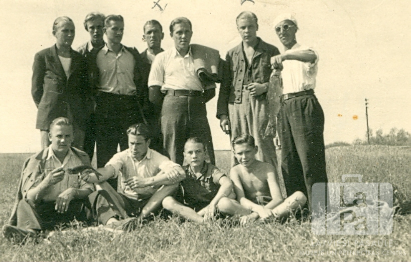 Jaunekļu grupa no Ausmas nometnes Kleinkecā (amerikāņu zonā) pļavā pēc peldēšanās. Priekšā sēž, no kreisās: nezināms, ? Slaidiņš, Gunārs Muravskis un Oļģerts Gunārs Orleāns. Aizmugurē, no kreisās: ceturtais ? Pfafs un sestais. ? Macāts.