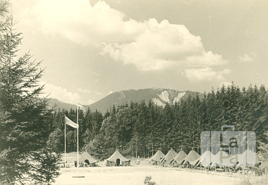 Teltis jauniešu vasaras nometnē Oberammergavā, Bavārijā, kur nometņoja arī jaunieši no Ausmas nometnes Kleinkecā (amerikāņu zonā). Priekšplānā ir plašs laukums meža malā ar karoga mastu laukuma vidū; laukuma malā ir telšu rinda. Fonā, aiz meža, ir kalnu grēda. Nometni rīkoja organizācija "United Nations Relief and Rehabilitation Administration" (UNRRA).