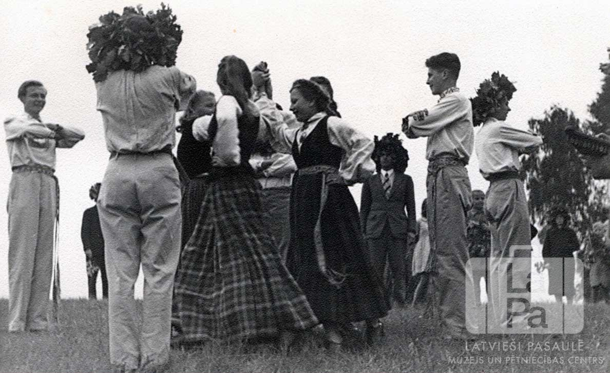 Tautas deju grupa uzstājas Jāņu vakara sarīkojumā Ausmas nometnē Kleinkecā (amerikāņu zonā). Vidū, iekšējā aplī, uz riņķi solo jaunietes tautastērpos; āpkārt stāv puiši gaišos tērpos, izrakstītām jostām ap vidukli un sakrustotām rokām. Vairākiem jaunekļiem galvā ir lieli lapu vainagi. Pirmais no kreisās: Ādams Sils. Vidū ir redzama Ārija Plaude. Labajā pusē, profilā, ir redzams Varis Plūdonis.