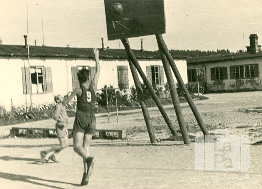 Divi zēni spēlē basketbolu sporta spēlēs Ausmas nometnē Kleinkecā (amerikāņu zonā) 1947. gada vasarā. Vienam zēnam uz tumšā sporta tērpa ir cipars "9". Bumba atrodas virs basketbola groza. Fonā ir gaišas vienstāvu mūra ēkas. No kreisās: Andris Kadeģis, Oļģerts Gunārs Orleāns (met bumbu grozā). Par šo gadījumu Oļģerts Gunārs Orleāns stāsta: "Vasaras brīvlaikā daudz laika, pavadījām spēlējot basketbolu vai volejbolu."